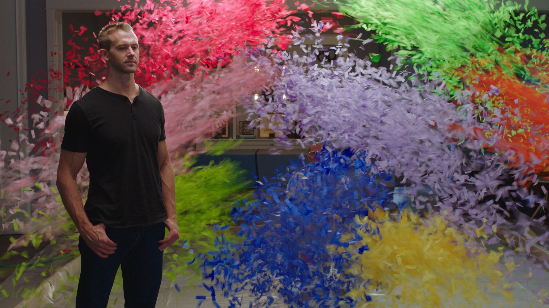 We set off confetti cannons. We created a torrential downpour inside a living room. Everything happened live, in camera. Nothing phased him, which only made it better. Peyton stayed completely unfazed, and that calm, dry energy sold the concept instantly.